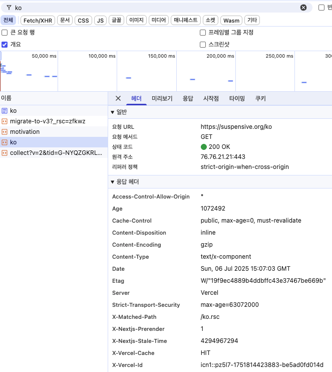 문제는 빌드된 폴더의 server/app 하위에 ko.rsc 파일의 내용이 바로 직렬화된 RSC 응답이었어요. 네트워크 탭을 열고 https://suspensive.org/ko 를 확인해보니 ko로 요청하는 요청이 두 개가 있었어요.